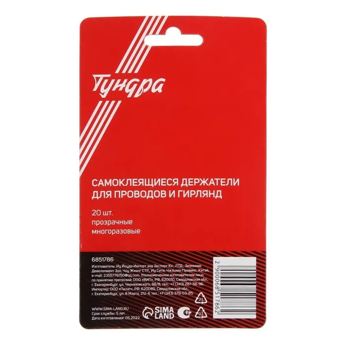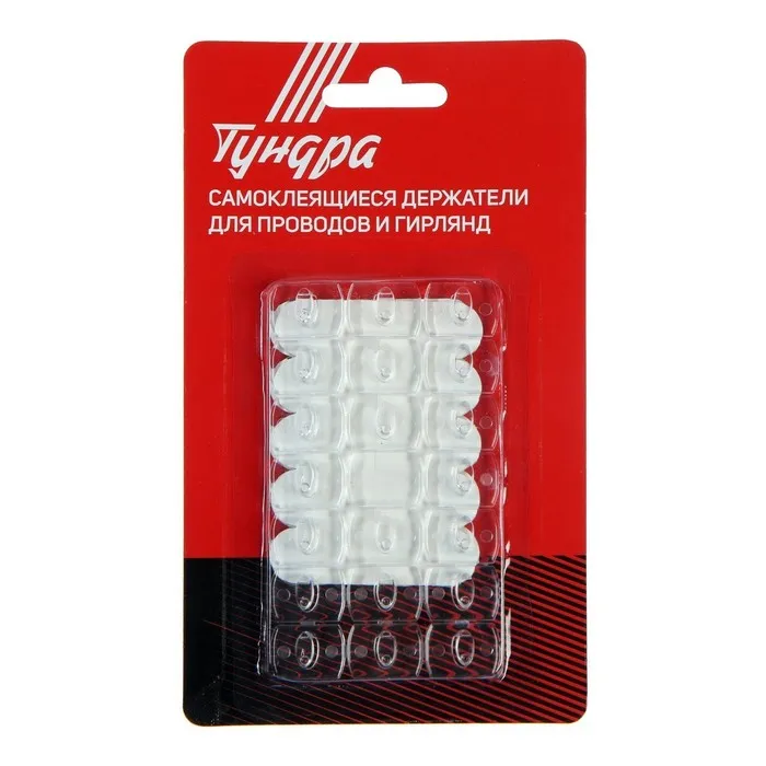Держатель самоклеящийся для проводов и гирлянд ТУНДРА применяется для легкого, надежного и безопасного крепления разнообразных аксессуаров на вертикальной и горизонтальной поверхностях.