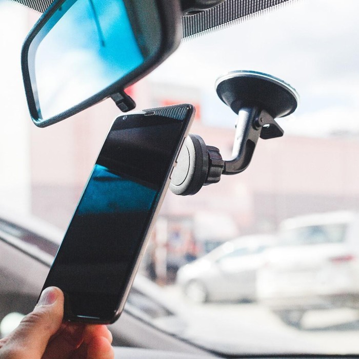 Держатель для телефона с магнитной основой и присоской для крепления к лобовому стеклу или другим ровным поверхностям. Телескопическая конструкция позволяет регулировать расстояние между магнитами для совместимости с разными моделями телефонов.