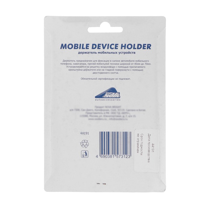 Универсальный магнитный держатель Nova Bright предназначен для фиксации в салоне автомобиля мобильного телефона, навигатора и прочей мобильной техники. Устанавливается на вентиляционную решетку с помощью встроенного зажима. Рекомендован для устройств весом до 200 гр. Благодаря шарнирному креплению способно вращаться на 360 градусов.
