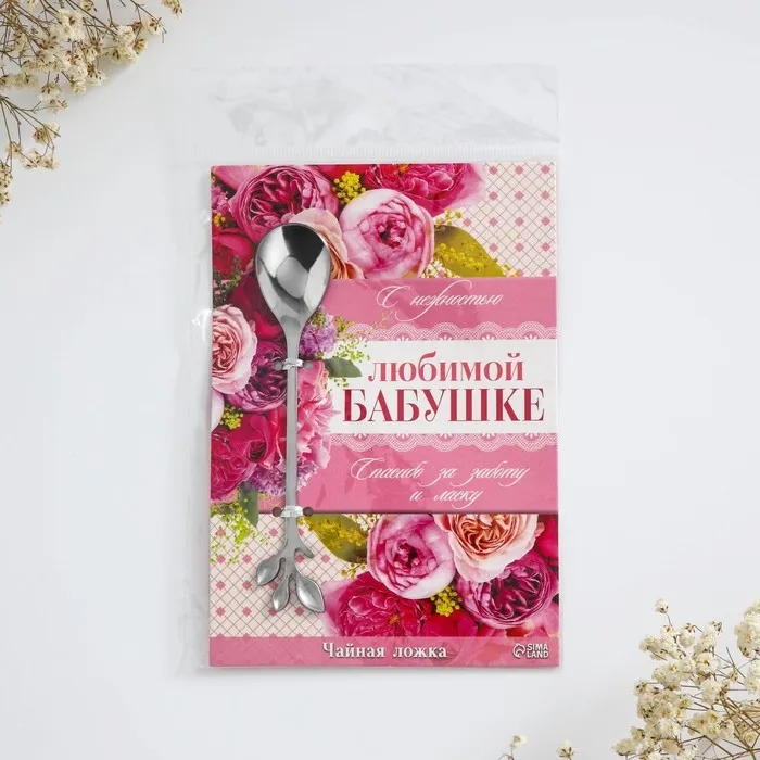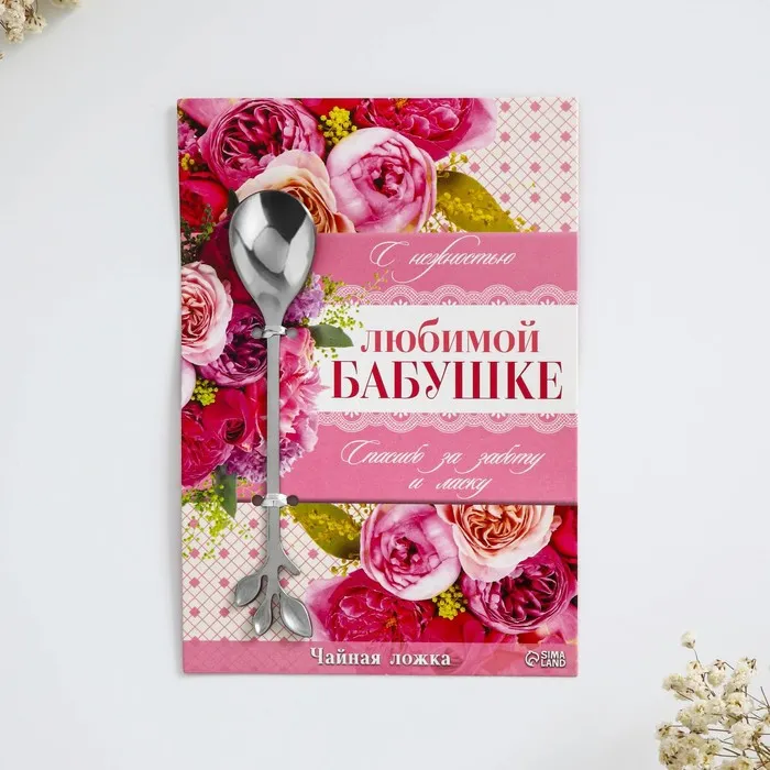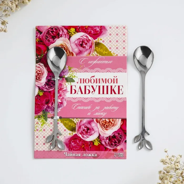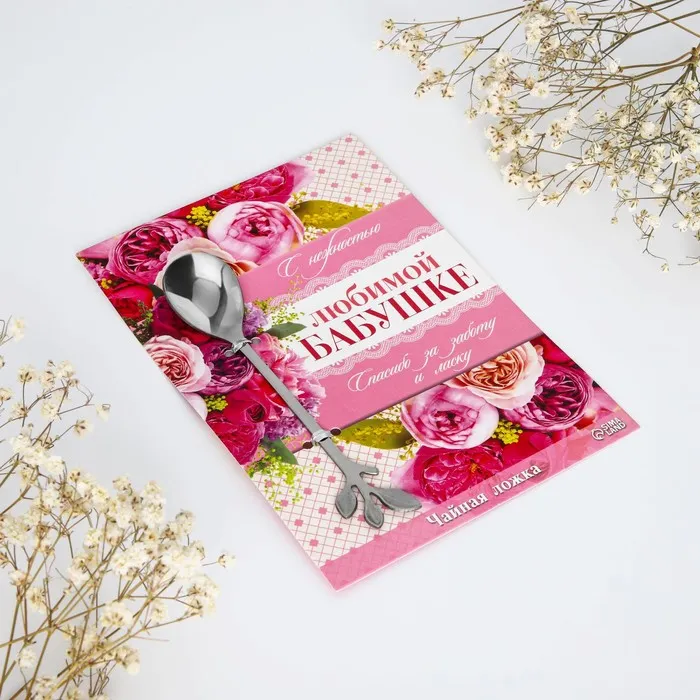 Ложка с лазерной гравировкой и изящной рукояткой преподносится на красочной открытке. На оборотной стороне изделия специально отведено место для подписи: кому и от кого был вручён подарок.