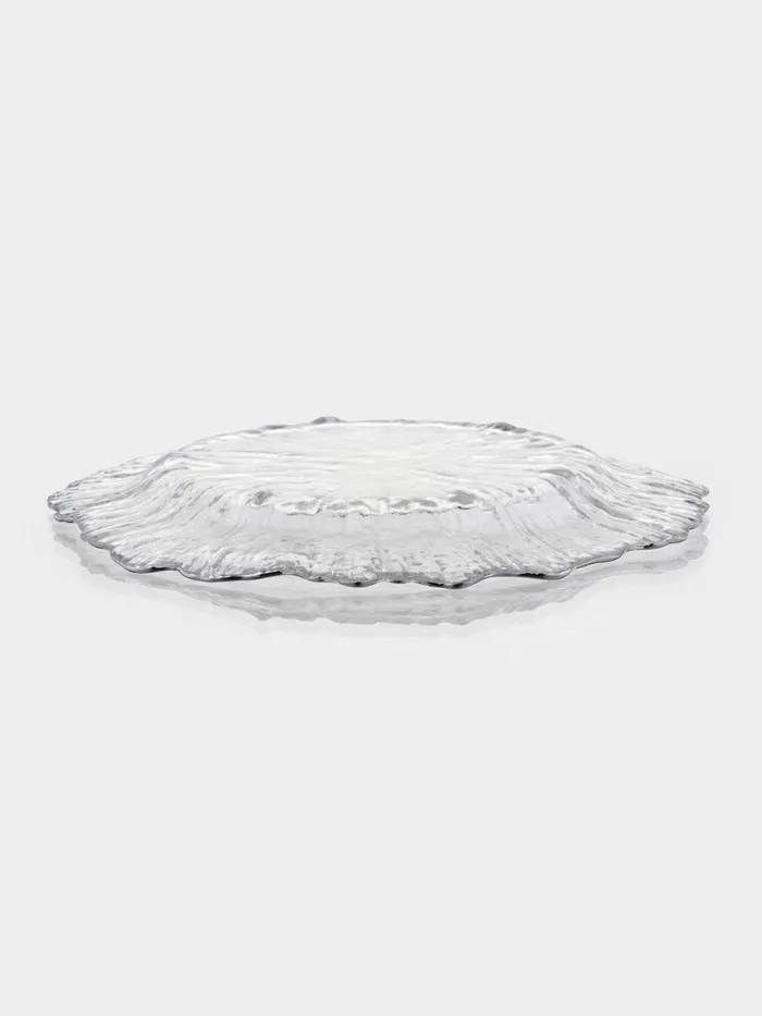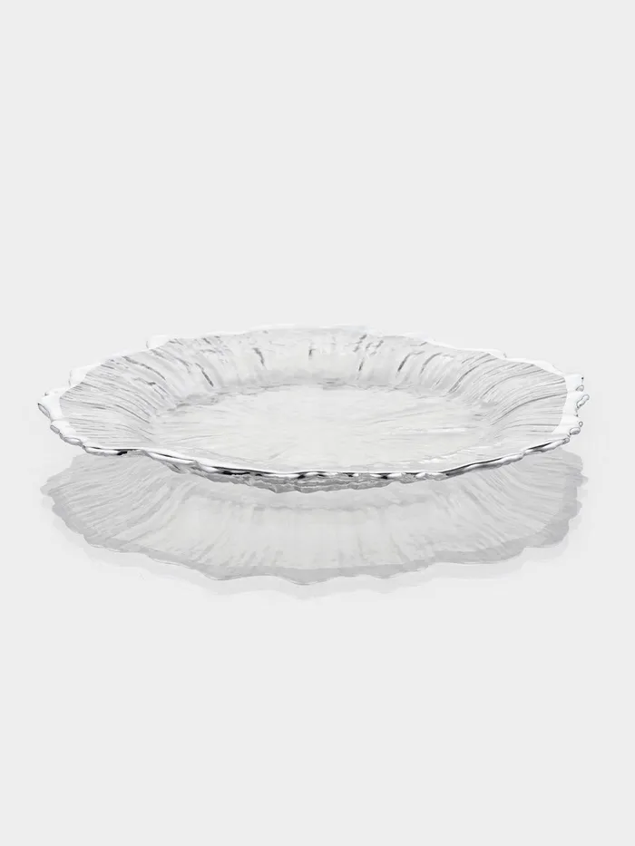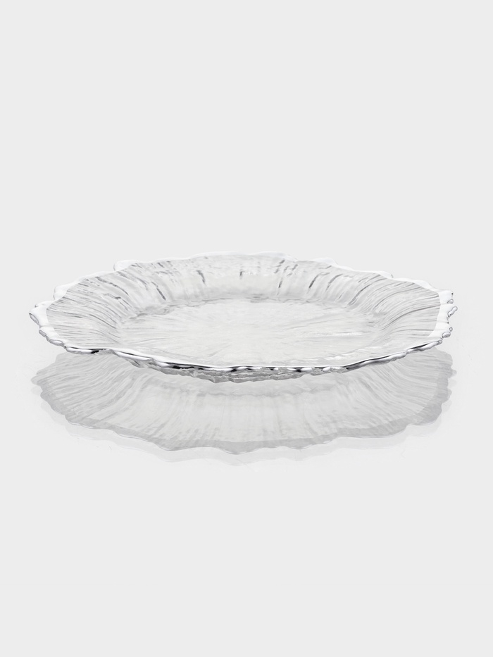 Элегантность, подчёркнутая сиянием серебра. Плоская тарелка с серебряной отводкой – это сочетание прозрачного стекла и тонкой декоративной окантовки, которая придаёт изделию благородный вид.