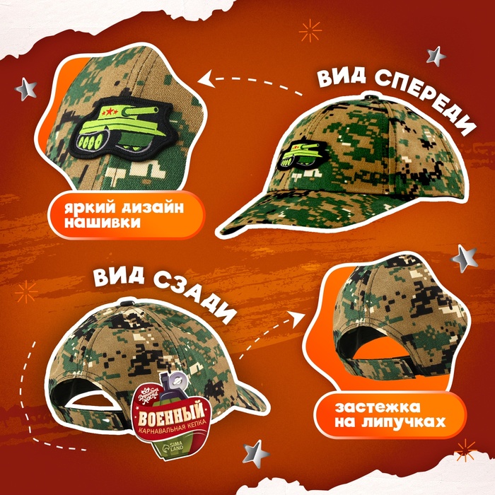 Карнавальная кепка «Военный» с нашивкой-танком — идеальный аксессуар для тематических мероприятий.