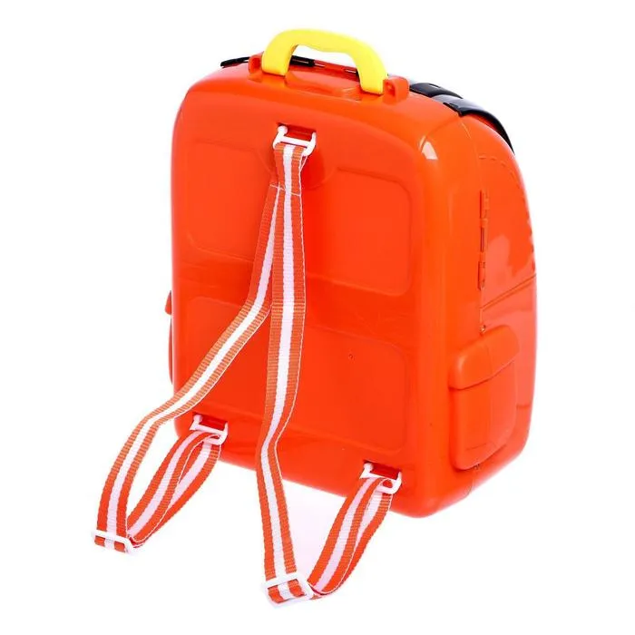 - Подходит с 3 лет: все элементы выполнены из прочного пластика, без острых краёв. Инструменты удобно ложатся в маленькие руки, а рюкзак регулируется под рост ребёнка.