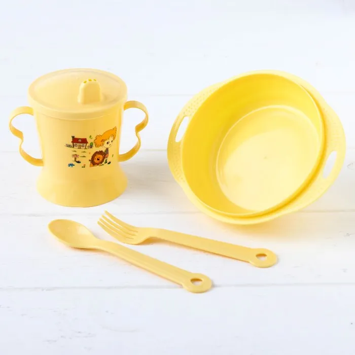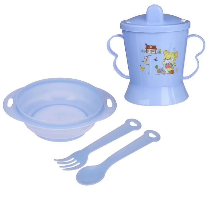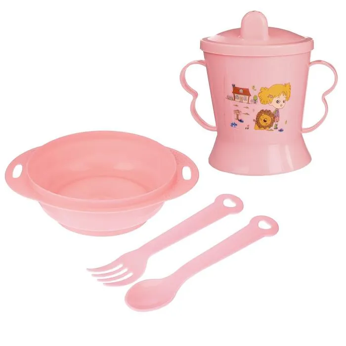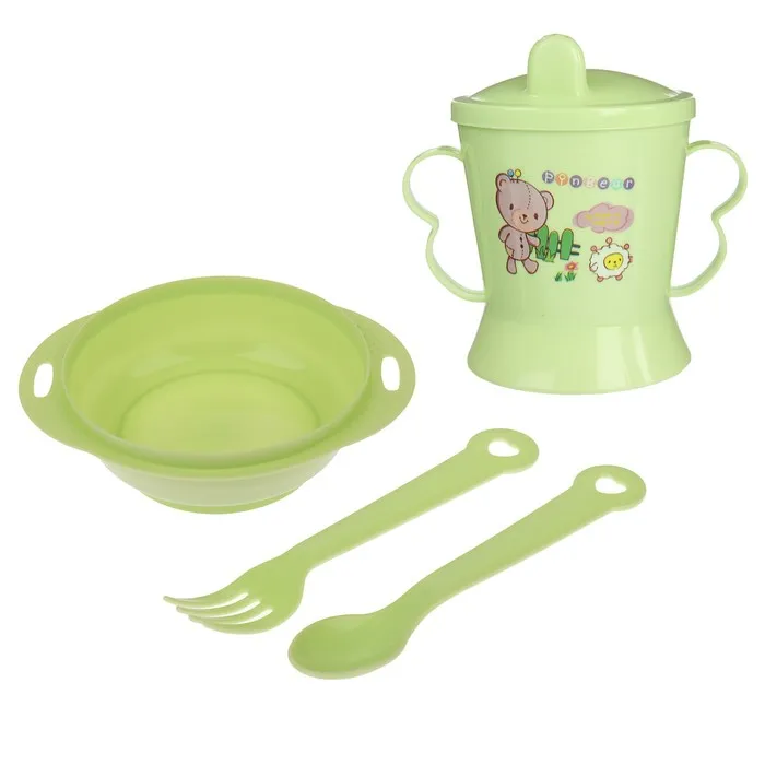Детская посуда в наборе, 4 предмета: миска, ложка, вилка, поильник с твёрдым носиком 200 мл, цвета МИКС — Характеристики