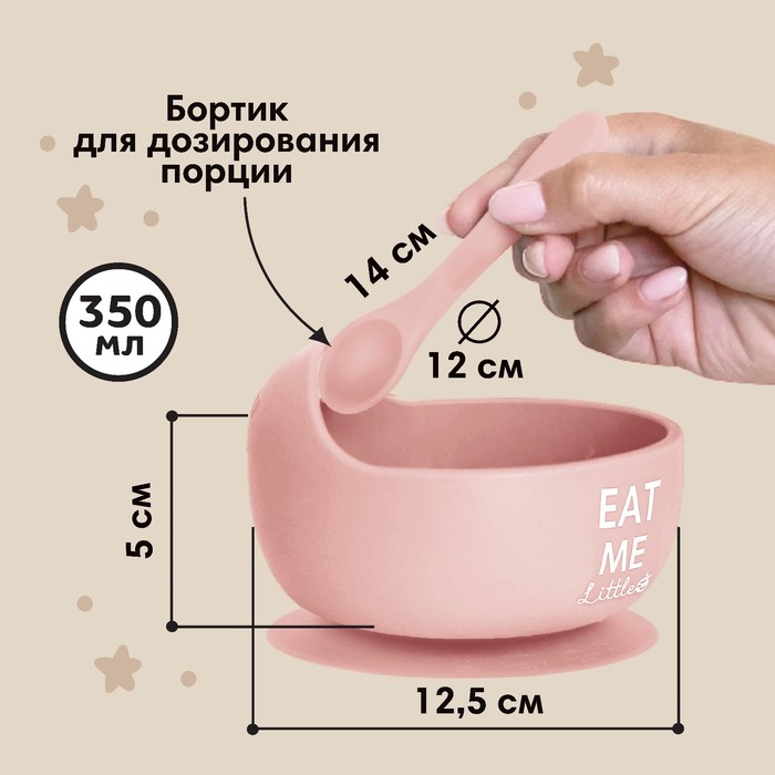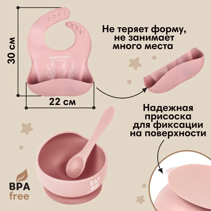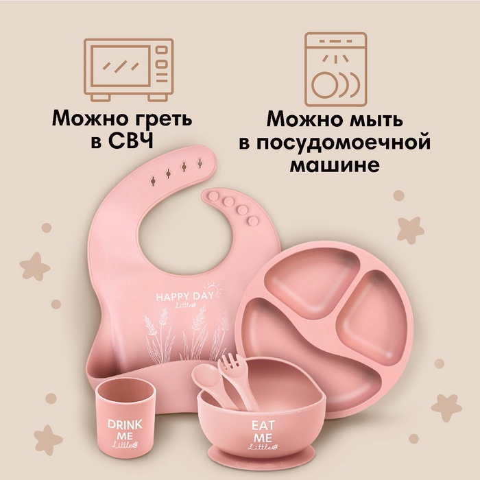 Детская посуда в наборе M&B: нагрудник, тарелка 2шт, стакан, приборы, силикон, пыльная роза — Характеристики