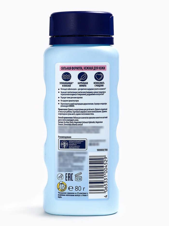 Способ применения: небольшое количество присыпки нанести на тампон/ватный диск и слегка припудрить кожу.