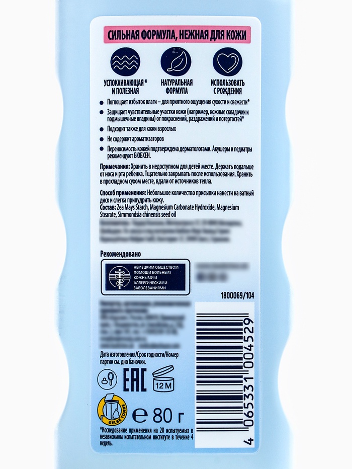 Состав: Zea Mays Starch, Magnesium Carbonate Hydroxide, Magnesium Stearate, Simmondsia Chinensis Seed Oil.