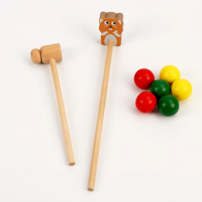 Игра с деревянной стучалкой развивает мелкую моторику, координацию движений и ловкость. Ребёнок учится концентрироваться, тренирует точность и силу удара, а также знакомится с основными цветами и формами. Это не только развлечение, но и полезный инструмент для раннего развития.