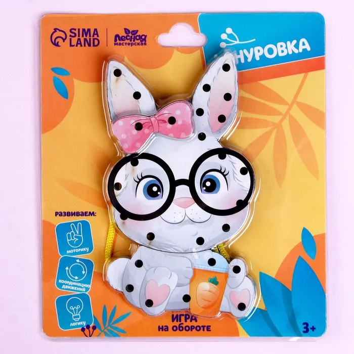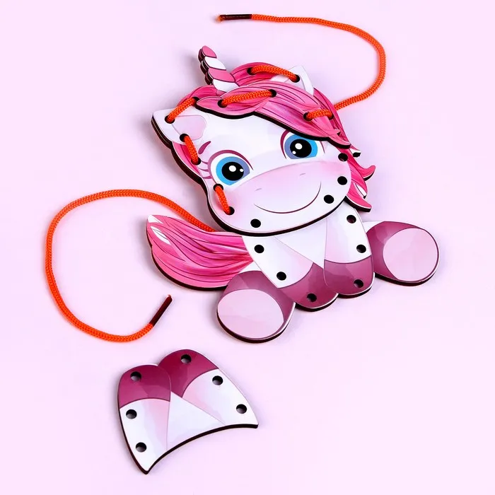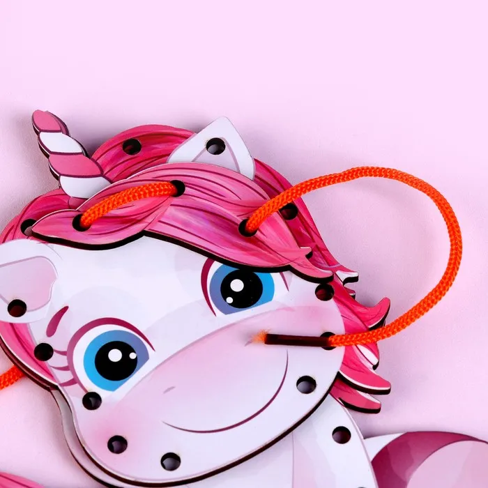Шнуровка представляет собой развивающую игрушку выполненную в виде милого единорога, суть которой в том, чтобы пропустить верёвочку через отверстия в деревянном основании.