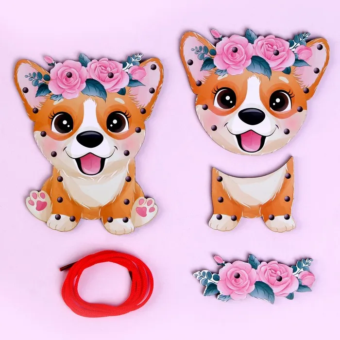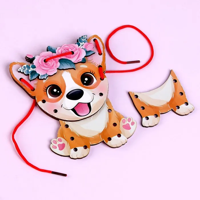 Шнуровка представляет собой развивающую игрушку выполненную в виде милого корги, суть которой в том, чтобы пропустить верёвочку через отверстия в деревянном основании.