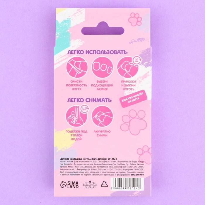 1. Размягчите клеевой слой в тёплой воде (5-10 минут).2. Аккуратно снимите накладные ногти.В наборе 24 шт.