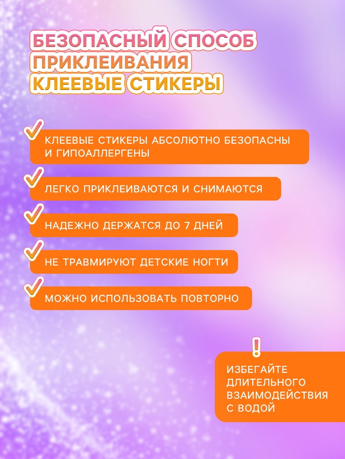 Наши накладки выполнены из высококачественного гипоаллергенного материала, который абсолютно безвреден для детской кожи. Они легко крепятся и снимаются, позволяя малышкам экспериментировать со своим стилем сколько угодно раз.