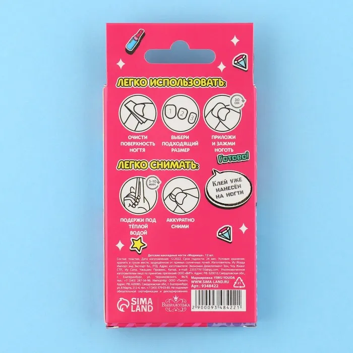 Детские накладные ногти «Модница», 12 шт — Характеристики