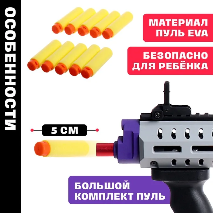 - Стреляет мягкими пулями, что делает его безопасным для игр. Длина пуль составляет 5 см, диаметр — 1,3 см.