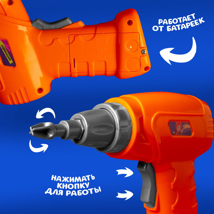 Игрушечный шуруповерт с насадками станет отличным дополнением к детскому конструктору и подарит юному мастеру увлекательную игру. Инструмент создан специально для детей, поэтому его удобно держать в руках, а насадки легко меняются. Работает от батареек, что делает процесс сборки ещё более реалистичным.