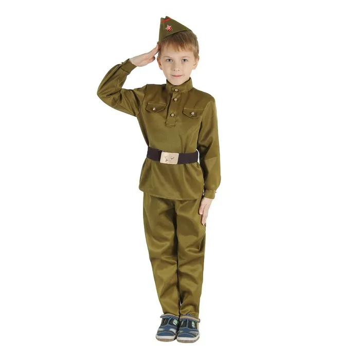 Детский карнавальный костюм «Военный» для мальчика, р-р 40, рост 152 см — отличный наряд для участия вашего малыша в патриотических представлениях, тематических и театральных постановках. Дизайн комплекта максимально приближён к солдатской форме далёких 40-х, чтобы юные защитники с головой окунулись в атмосферу боевых дней.