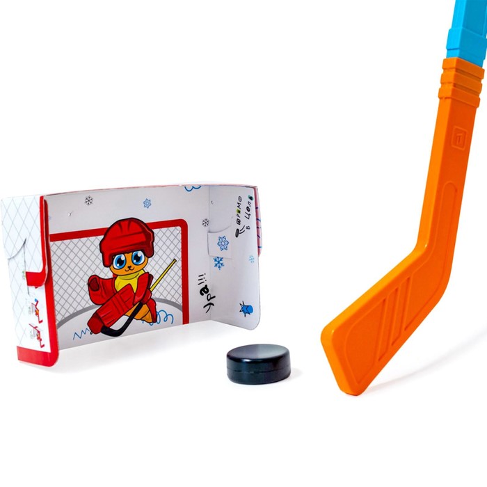 - В набор входят пластиковая клюшка, шайба и небольшие ворота с изображением милого персонажа.