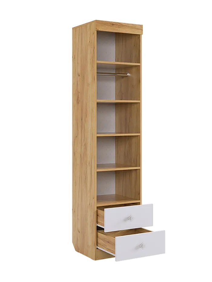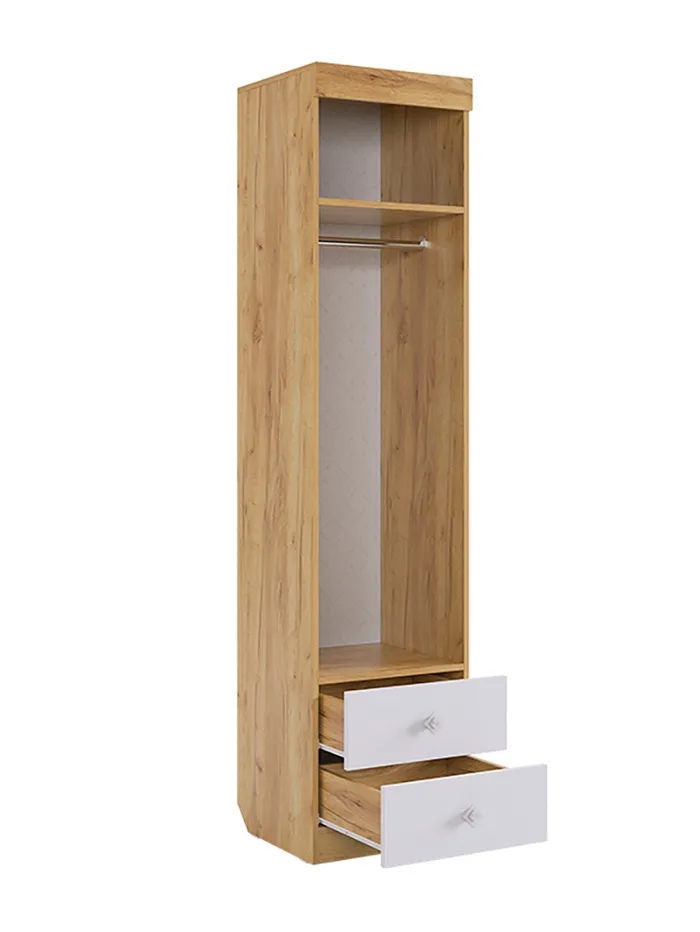 Комбинированный шкаф оснащен двумя прочными и вместительными выдвижными ящиками, позволяющими удобно расположить детские вещи, включая одежду, аксессуары и игрушки. Дополнительная просторная штанга позволяет развесить верхнюю одежду, обеспечивая оптимальный порядок и доступ ко всему необходимому ребенку. Наличие специального выреза под плинтус значительно облегчает процесс установки и гарантирует гармоничное сочетание шкафа с дизайном помещения.