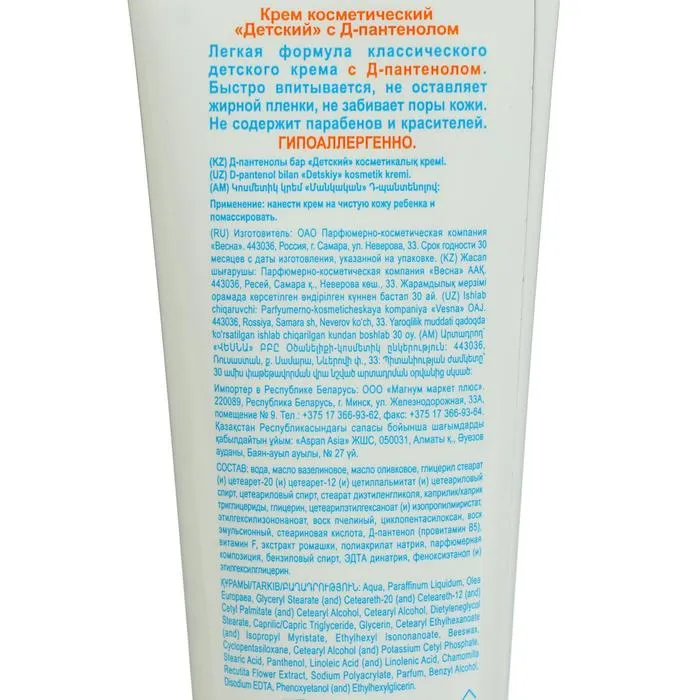 Детский крем “Весна” с Д-пантенолом - это нежный крем, специально разработанный для ухода за чувствительной кожей детей. Крем содержит Д-пантенол, который увлажняет и смягчает кожу, а также помогает восстановить ее естественный барьер. Крем легко наносится и быстро впитывается, не оставляя жирной пленки. Он идеально подходит для ухода за кожей после купания, а также для предотвращения раздражения и сухости. Д-пантенол помогает устранить покраснения кожи и опрелости. Детский крем Д-пантенол отлично справляется с раздражением и покраснениями, заживляет трещинки и предотвращает их появление. Детский крем быстро впитывается не оставляет жирной пленки,не забивает поры кожи не содержит парабенов и красителей хорошо увлажняет кожу.