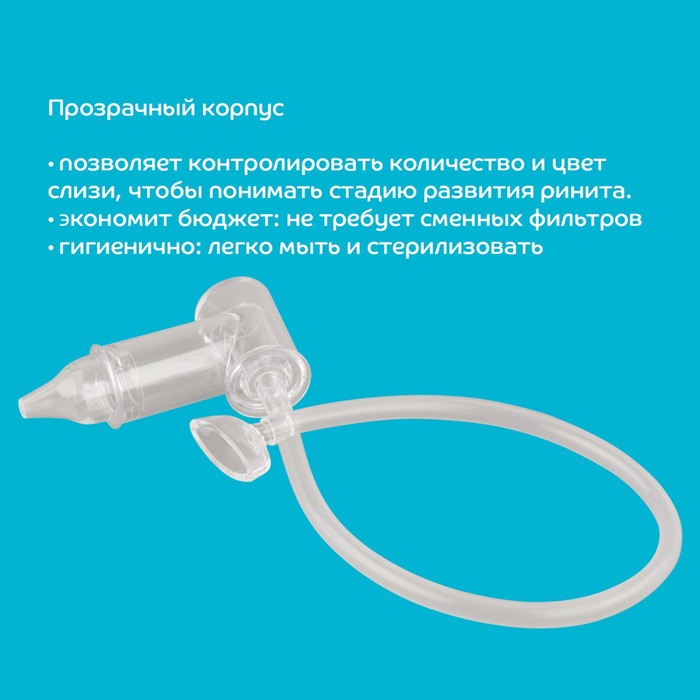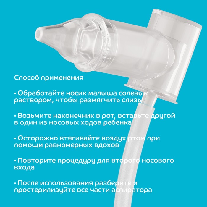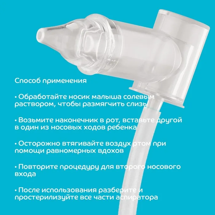 Аспиратор помогает очистить нос ребенка от слизистых выделений и облегчить дыхание. Прост в использовании и может применяться с самого рождения. Расширенное основание кончика аспиратора препятствует глубокому проникновению. Конструкция аспиратора позволяет регулировать интенсивность откачивания и исключает попадание слизи в рот взрослого.