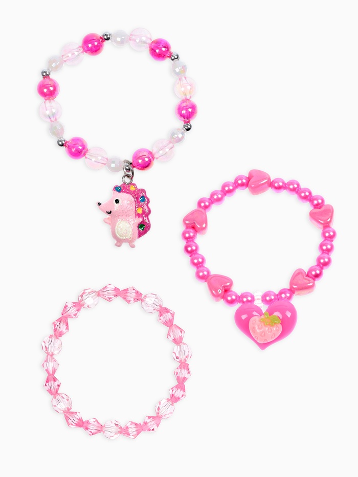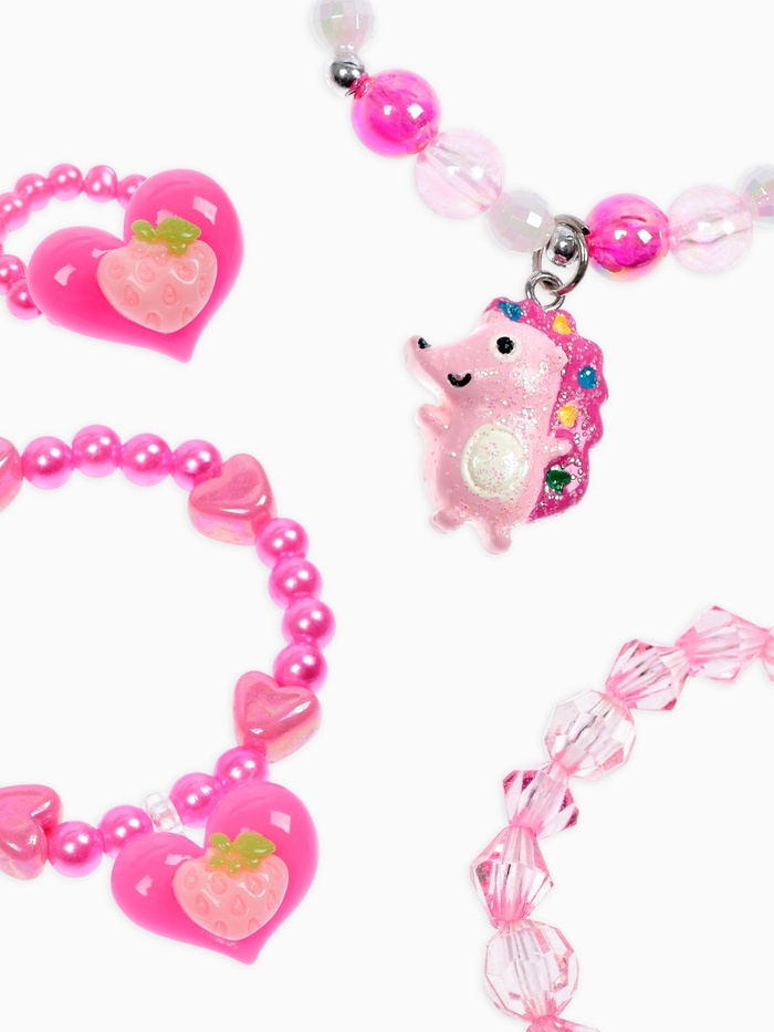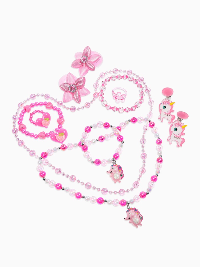 - Девять милых элементов из пластика: красивые клипсы, блестящие бусы, симпатичное кольцо и стильный браслет — всё выполнено в приятной пастельной цветовой гамме.