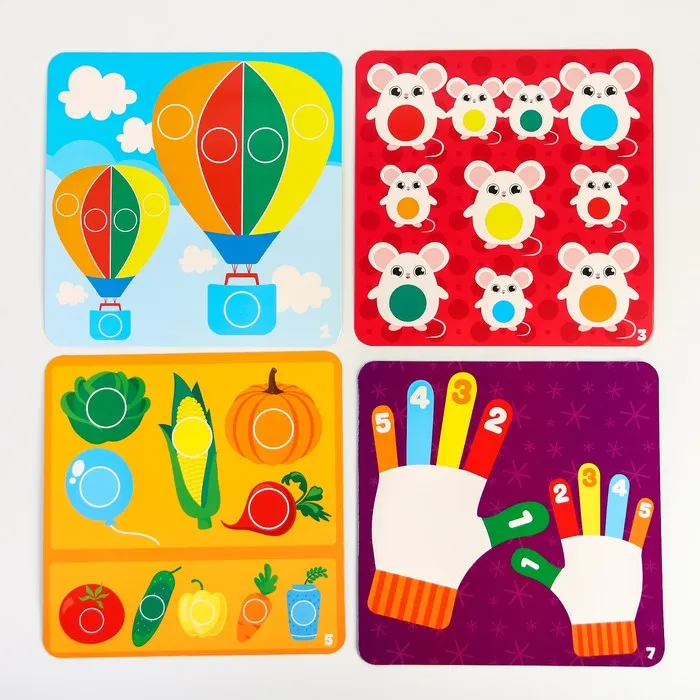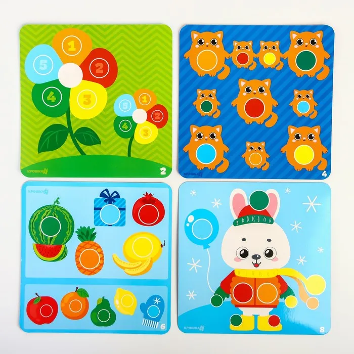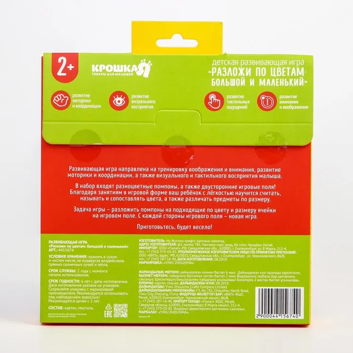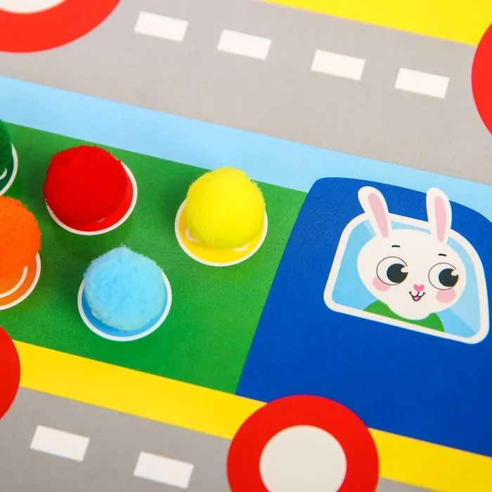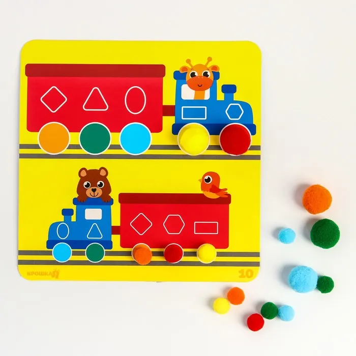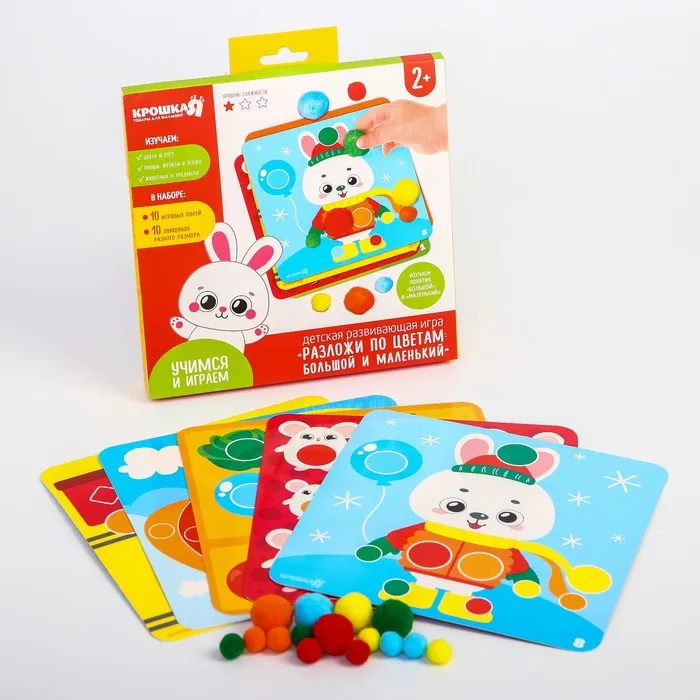 Развивающая игра направлена на тренировку воображения и внимания, развитиемоторики и координации, а также визуального и тактильного восприятия малыша.В набор входят разноцветные помпоны. а также двусторонние игровые поля!Благодаря занятиям в игровой форме ваш ребёнок с лёгкостью научится считать‚называть сопоставлять цвета а также различать предметы по размеру.Задача игры - разложить помпоны на подходящие по цвету и размеру ячейкина игровом поле. С. каждой стороны игрового поля - новая игра .