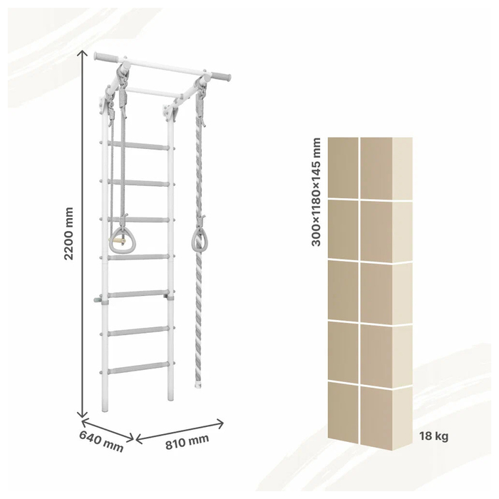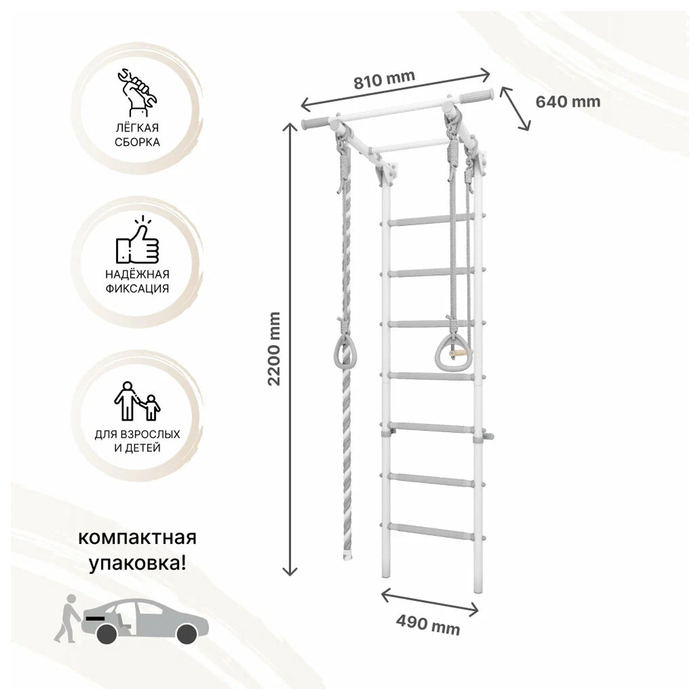 Детский спортивный комплекс с игровыми элементами подходит для активного досуга и укрепления здоровья. Массажные ступени из мягкого пластика обеспечивают антискольжение, развивают мелкую моторику и служат для профилактики плоскостопия. Комплекс устанавливается на стене с помощью креплений, которые входят в комплект.