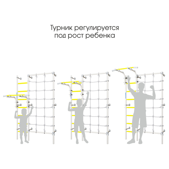 В комплексе есть подвижный турник, который можно перемещать по вертикали и фиксировать в подходящем под рост ребенка положении. Ручки на турнике, размещенные в двух направлениях, позволяют выполнять упражнения на различные группы мышц.