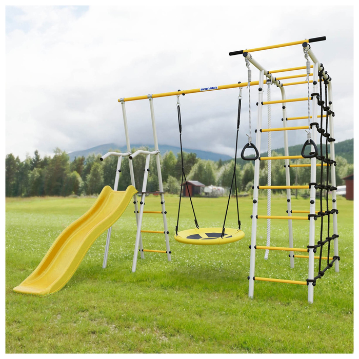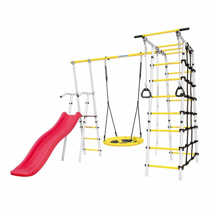 Спортивный комплекс подходит для установки на улице, например, на дачном участке. В комплект входит удобная и безопасная горка, рядом с которой располагаются качели. Другая часть комплекса состоит из лестницы и турника и канатного лаза, сделанного из шнура повышенной прочности. Также, предусмотрены гимнастические кольца.