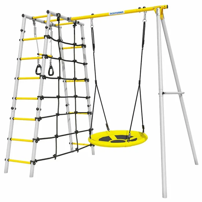 Спортивный комплекс подходит для установки на улице, например, на дачном участке. Разработан специально для детей от 3 лет. С помощью него дети развивают координацию, ловкость и силу, а также могут весело проводить время на свежем воздухе. В комплект входят удобные и безопасные качели. Другая часть комплекса состоит из лестницы, рукохода и канатного лаза, сделанного из шнура повышенной прочности. Также, предусмотрены гимнастические кольца.
