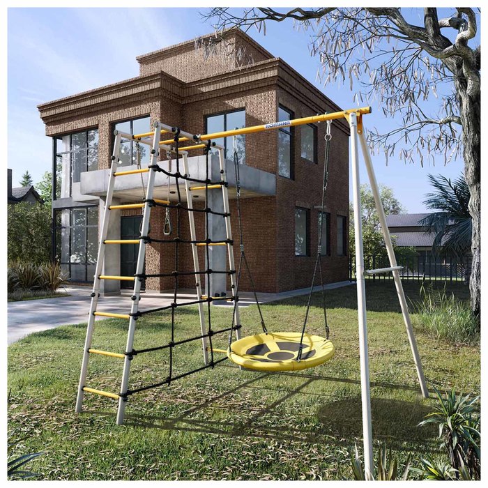 Спортивный комплекс подходит для установки на улице, например, на дачном участке. Разработан специально для детей от 3 лет. С помощью него дети развивают координацию, ловкость и силу, а также могут весело проводить время на свежем воздухе. В комплект входят удобные и безопасные качели. Другая часть комплекса состоит из лестницы, рукохода и канатного лаза, сделанного из шнура повышенной прочности. Также, предусмотрены гимнастические кольца.