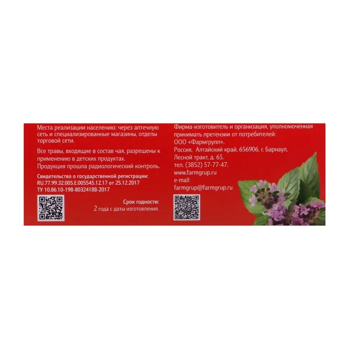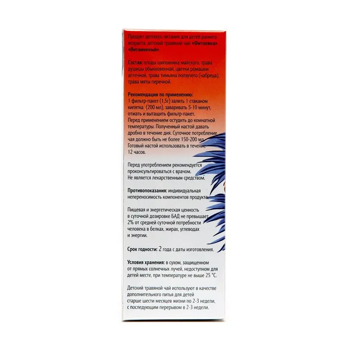 Состав: цветки ромашки аптечной, трава душицы обыкновенной, плоды шиповника майского, трава тимьяна ползучего (чабреца), трава мяты перечной.
