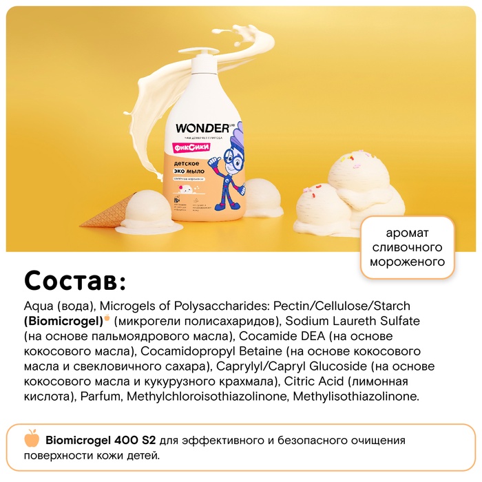 Жидкое мыло для детей WONDER LAB со сладким ароматом сливочного мороженого идеально подойдет для малышей любого возраста. Нежный аромат любимого детского лакомства и гелевая консистенция точно понравится вашему малышу и поможет привить полезную привычку мыть руки. Такая неприятная ранее процедура станет игрой и будет вызывать только приятные ассоциации. Детское жидкое мыло бережно очищает, смягчает и успокаивает нежную кожу ребенка. Мыло полностью смывается водой, не сушит кожу рук и отлично подходит для умывания.