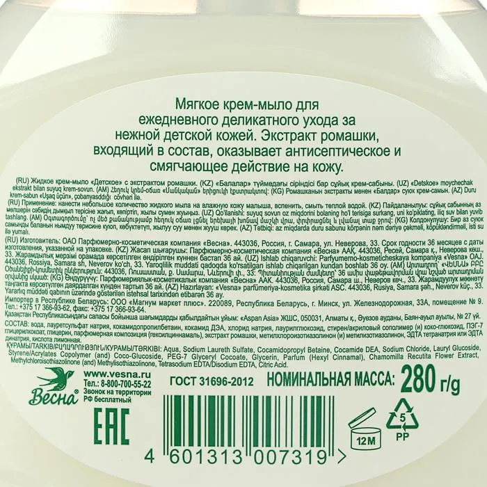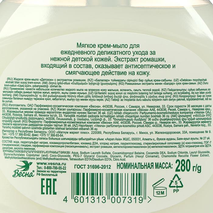 Детское крем-мыло с экстрактом ромашки, 280 мл — Характеристики
