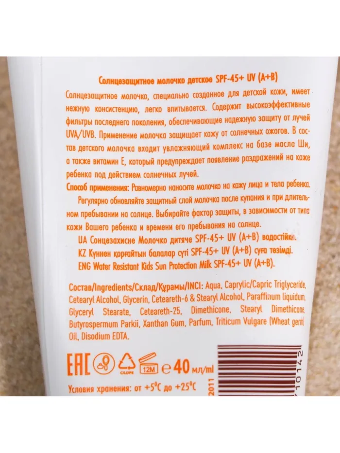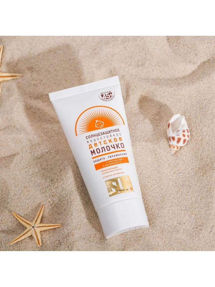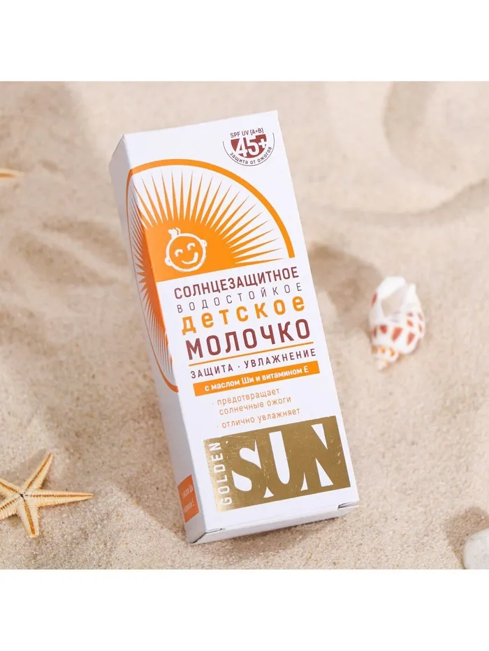 Детское молочко солнцезащитное "Golden Sun" SPF-45+ UV (A+B) водостойкое 40 мл. Детское молочко солнцезащитное SPF-45+ UV (A+B) водостойкое: -с маслом Ши и витамином Е. -предотвращает солнечные ожоги. -отлично увлажняет и смягчает. -без красителей. Солнцезащитное молочко, специально созданное для детской кожи, имеет нежную консистенцию, легко впитывается. Содержит высокоэффективные фильтры последнего поколения, обеспечивающие надежную защиту от лучей UVA/UVB. Применение молочка защищает кожу от солнечных ожогов. В состав детского молочка входит увлажняющий комплекс на базе масла Ши, а также витамин Е, который предупреждает появление раздражений на коже ребенка под действием солнечных лучей. Детское молочко солнцезащитное SPF 45+ - белого цвета, нежной консистенции.