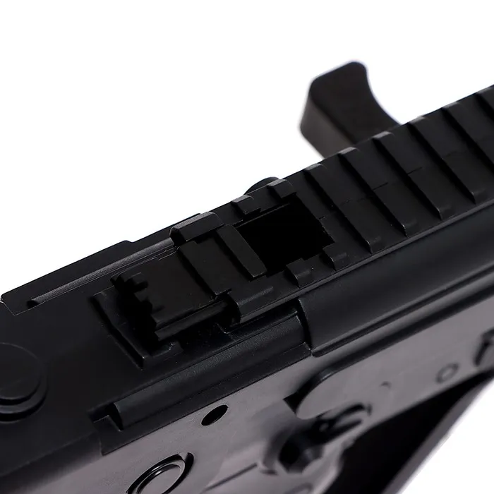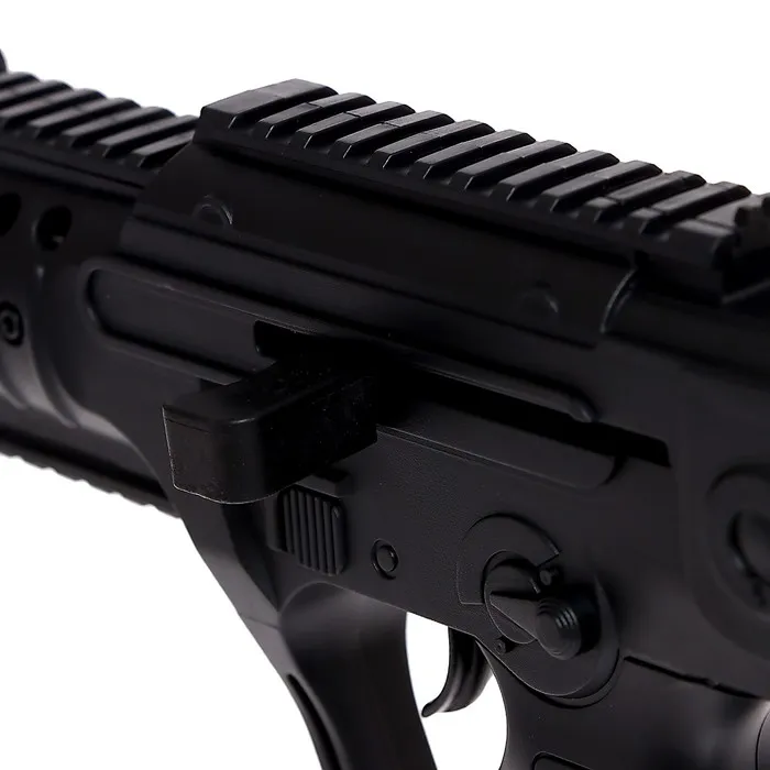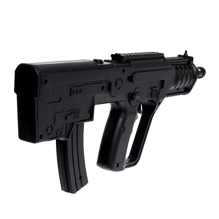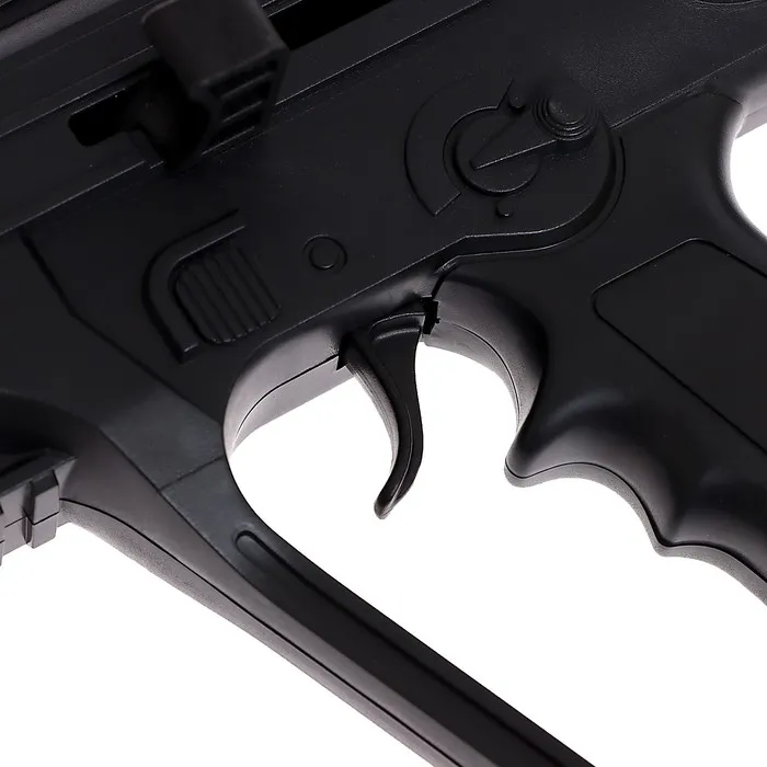 Оружие выполнено из высококачественного пластика и выглядит очень реалистично. Помогите ребёнку совершить выстрел: для этого сдвиньте крышку в верхней части винтовки и засыпьте пульки в открывшийся отсек. Малыш прицелится и спустит курок.
