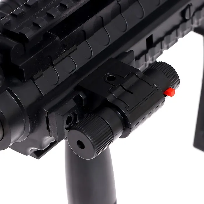 - Лазер и фонарик: автомат оснащён лазерным прицелом и мощным фонариком, которые добавляют реалистичности в игру. Лазер помогает точно наводить цель, а фонарик делает возможным играть даже в темноте. Для работы достаточно 3 батареек типоразмера LR44 (идут в комплекте).