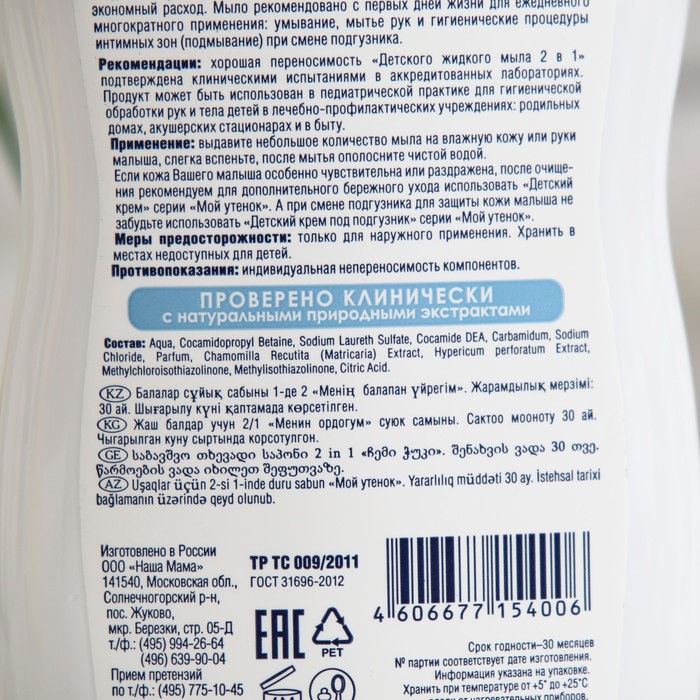 Предназначен для очищения тела и комфортного купания в нежной пене. Содержит натуральные экстракты ромашки и календулы, обладающие противовоспалительным, заживляющим, противомикробным и успокаивающим воздействием на кожу малыша. Обильная пена жидкого мыла обеспечивает экономный расход средства.