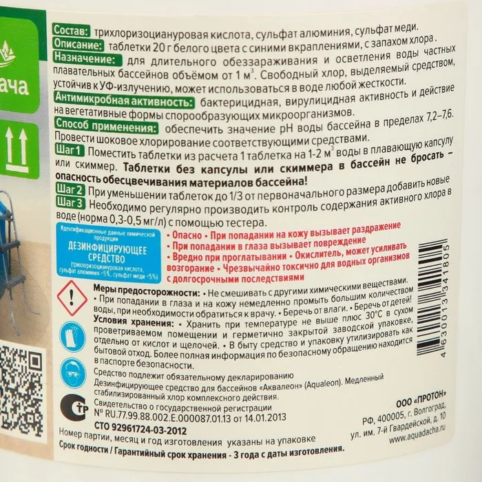 Дезинфектор для бассейна Аквадача "3 в 1" комплексный хлор предназначен для обеззараживания воды плавательных бассейнов, кроме бассейнов медицинского назначения, предназначенных для лечебных процедур, или с водой специального минерального состава.