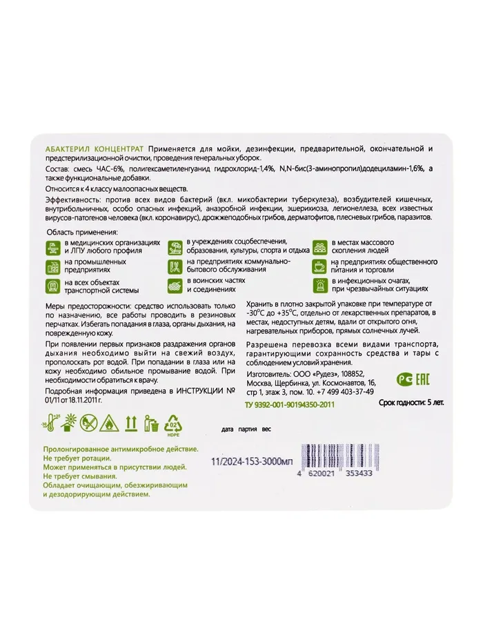 Дезинфицирующее средство Абактерил концентрат, 3 л — Характеристики
