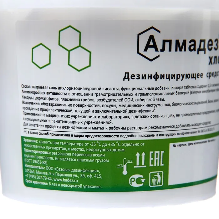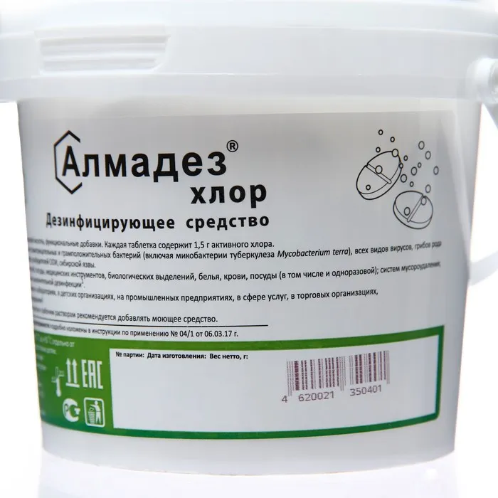 Дезинфицирующее средство Алмадез-хлор - это эффективное средство для дезинфекции различных поверхностей и предметов. Оно выпускается в форме таблеток весом 3,4 г, упакованных в блистеры по 100 штук.