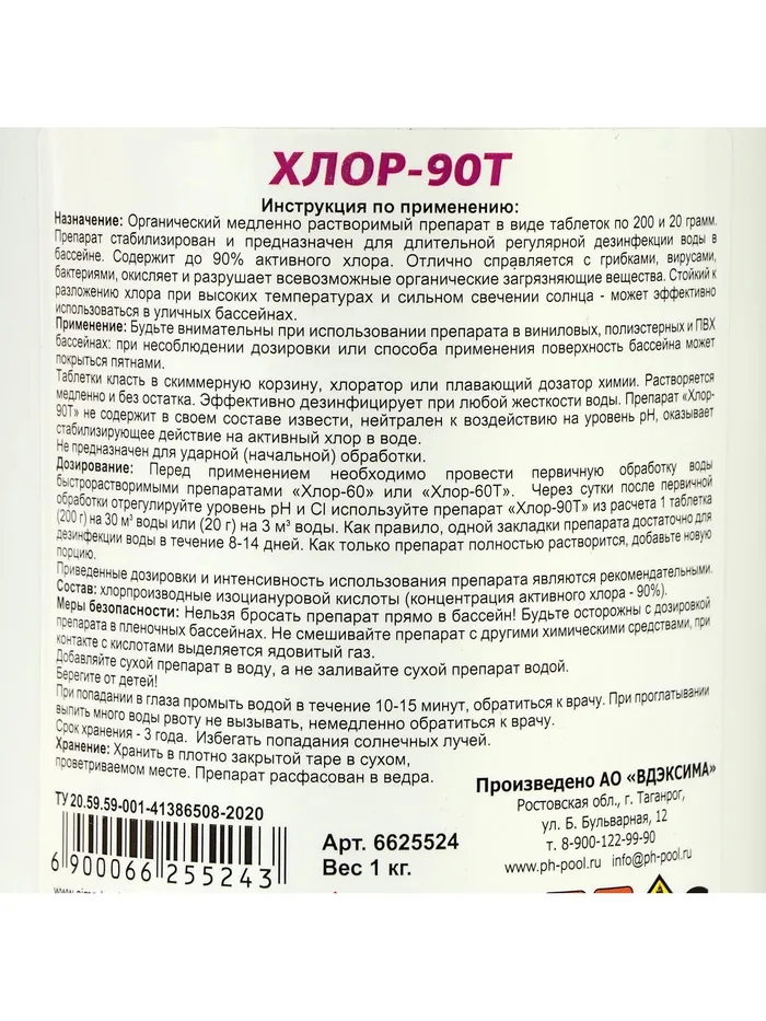 Дозирование: перед применением необходимо провести первичную обработку воды быстрорастворимыми препаратами «Хлор-60» и «Хлор-60Т». Через сутки после первичной обработки отрегулируйте уровень рН и Сl — используйте препарат «Хлор-90Т» из расчёта 1 таблетка (20 г) на 3 м³ воды. Как правило, одной закладки препарата достаточно для дезинфекции воды в течение 8–14 дней. Когда препарат полностью растворится, добавьте новую порцию.