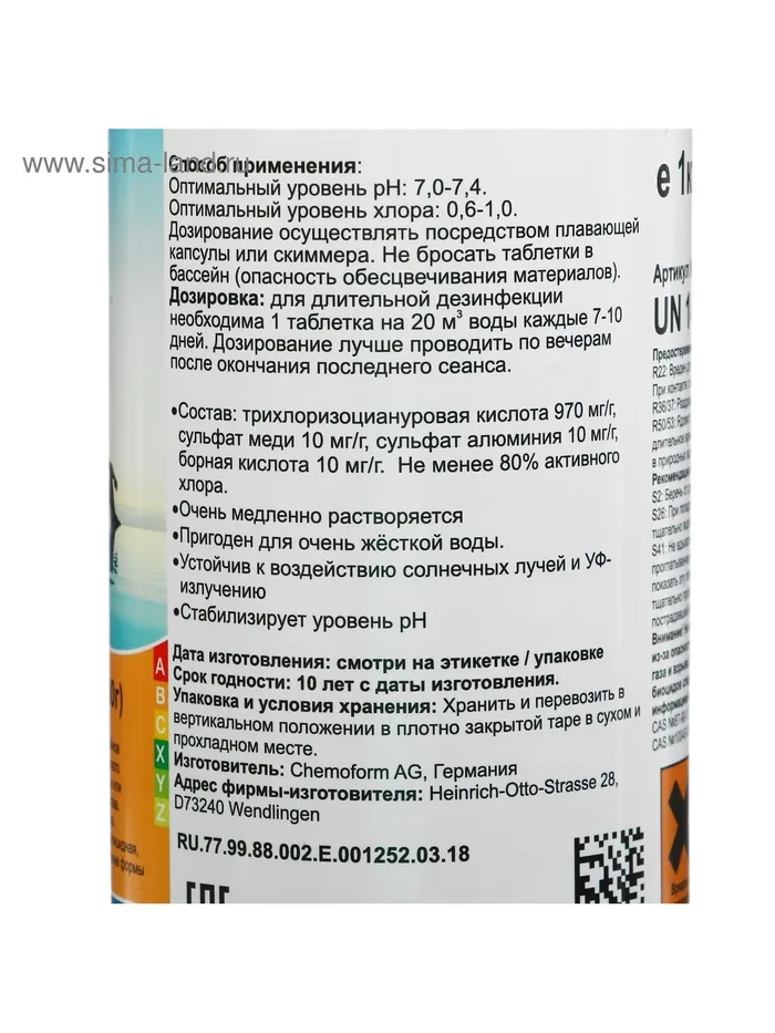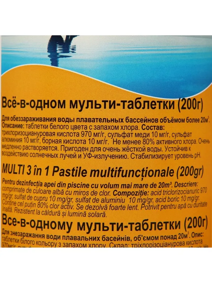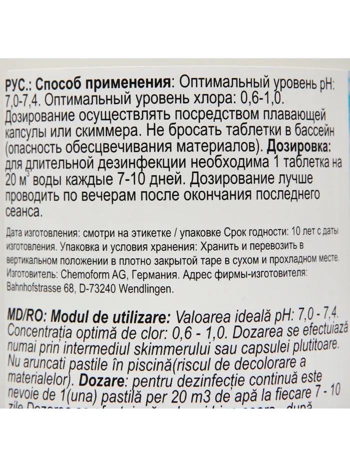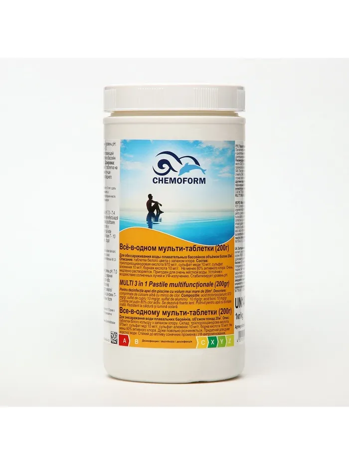 «Chemoform Всё-в-одном мульти-таблетки 200гр» служит для комплексной обработки воды плавательного бассейна. Основной функцией препарата является непрерывная дезинфекция воды, а дополнительными функциями — борьба с водорослями и помутнением воды. «Мульти-таблетки» содержат стабилизатор, препятствующий ускоренному распаду хлора в жаркую и солнечную погоду.