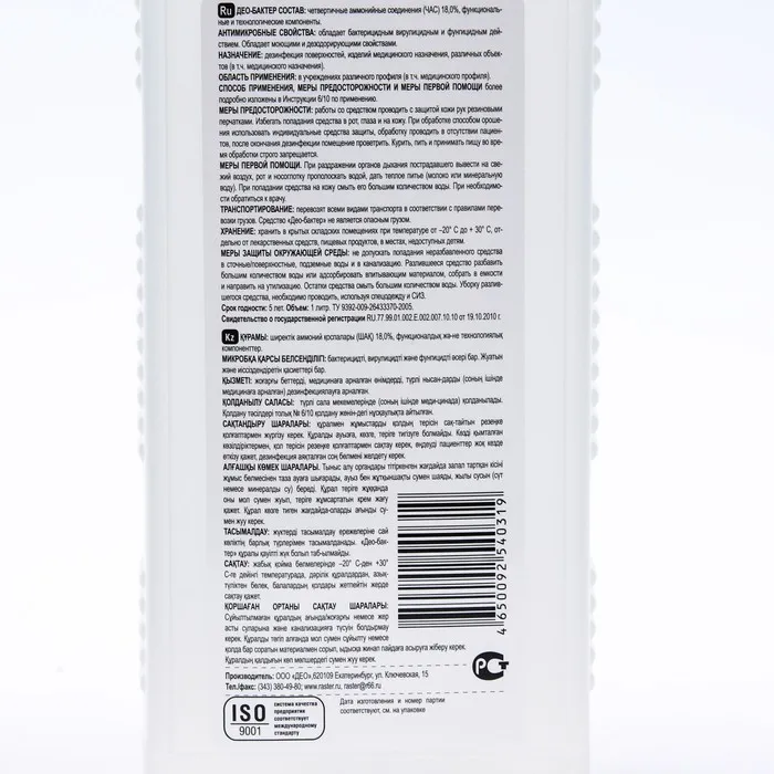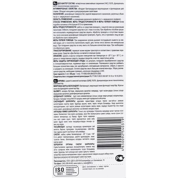 Дезинфицирующее средство Део-Бактер, без отдушки, 1 л — Характеристики