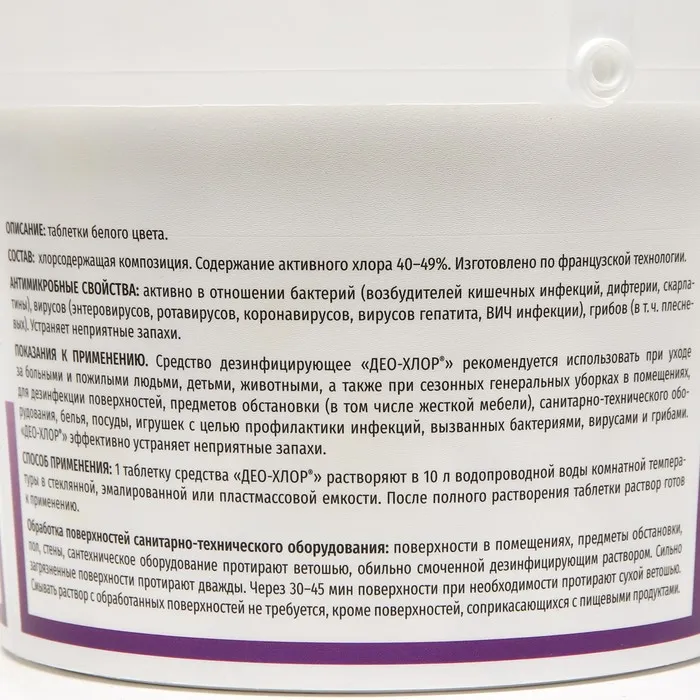 Дезинфицирующее средство Део-хлор таблетки. Обладает отбеливающим эффектом, хорошо растворяется в воде. Растворы прозрачные, имеют запах хлора, не портят обрабатываемые поверхности из дерева, стекла, полимерных материалов, а также посуду, игрушки, изделия медицинского назначения из коррозионностойких металлов, стекла, резин и пластмасс и предметы для ухода за больными.