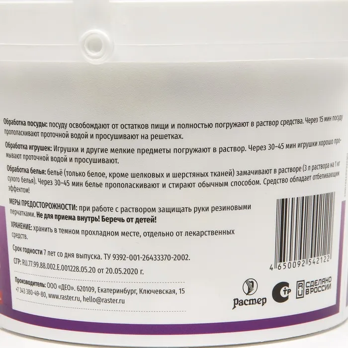 Способ применения: обработка поверхности в помещениях - предметы обстановки, пол, стены, сантехническое оборудование протирают ветошью, обильно смоченной дезинфицирующим раствором. Сильно загрязненные поверхности протирают дважды. Через 30-45 мин поверхности при необходимости протирают сухой ветошью. Обработка посуды – посуду освобождают от остатков пищи и полностью погружают в раствор средства. Через 15 мин посуду прополаскивают прочной водой и просушивают на решетках. Обработка игрушек – игрушки и другие мелкие предметы погружают в раствор. Через 30-45 мин игрушки хорошо промывают проточной водой и просушивают. Обработка белья – белое белье, кроме шелка и шерсти, замачивают в растворе (3 л раствора на 1 кг сухого белья). Через 30-45 мин белье прополаскивают обычным раствором. Средство обладает отбеливающим эффектом.