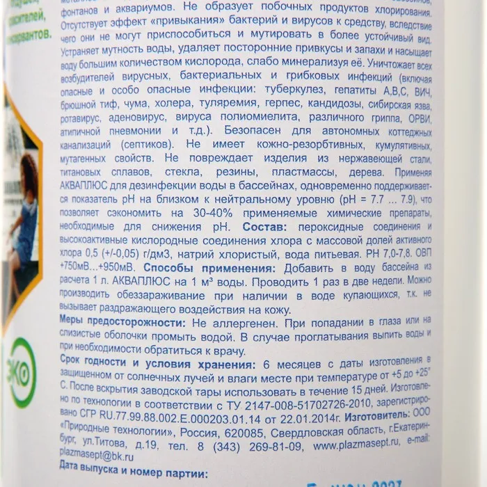 Способы применения: добавить в воду из расчета 1 л АКВАПЛЮС на 1 м³ воды. Проводить 1 раз в две недели.