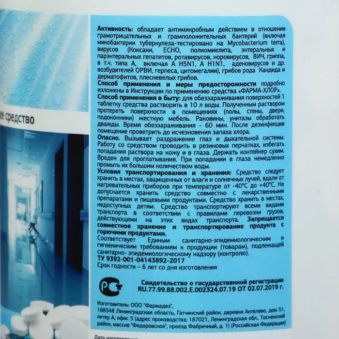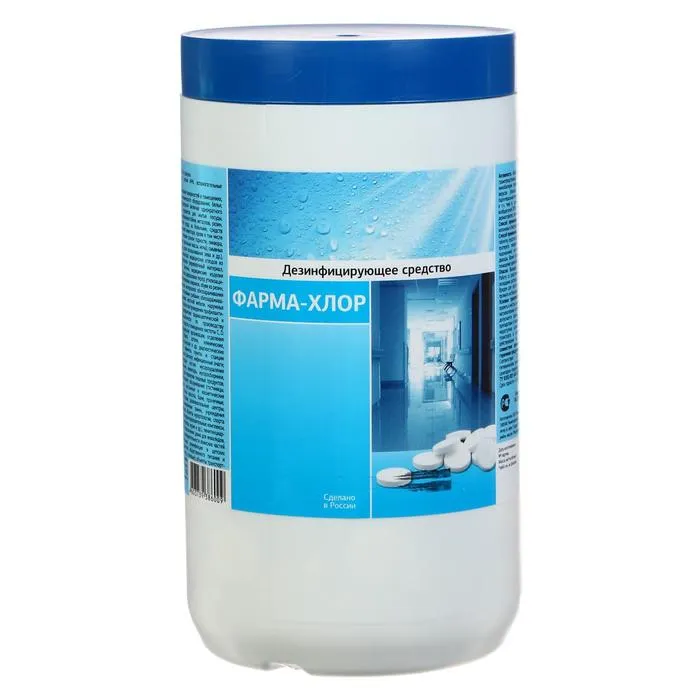 Дезинфицирующее средство «Фарма-Хлор» в таблетках представляет собой цилиндрические таблетки белого цвета с легкими оттенками от светло-бежевого до светло-серого, со слабым запахом хлора, В качестве действующего вещества в состав средства входит натриевая соль дихлоризоциануровой кислоты 84% , а также бикарбонат натрия, адипиновая кислота и сульфанол.