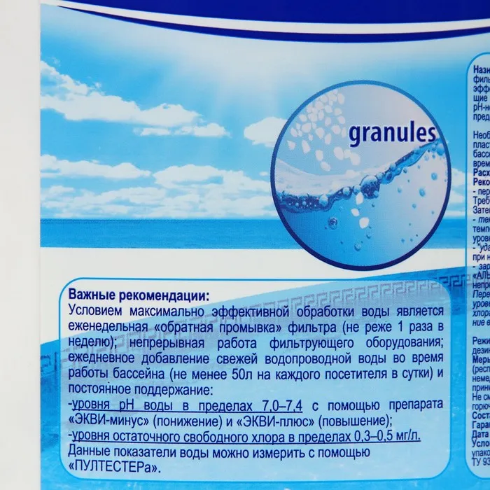 - “Ударная” обработка – 75-100 г на 10м3 воды. Технический перерыв в работе бассейна (не менее 12 часов) при непрерывной фильтрации. Затем фильтр тщательно промыть.