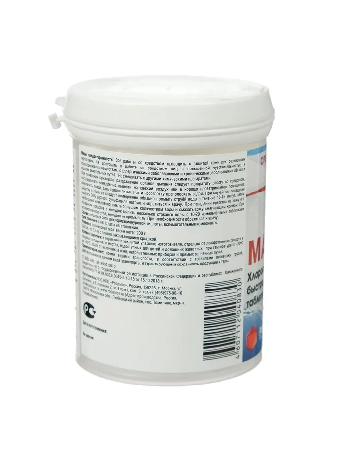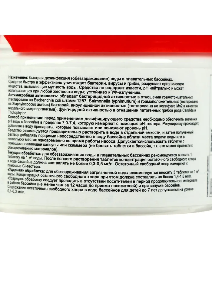 Назначение: предназначено для обеззараживания воды в системах хозяйственно-питьевого водоснабжения при централизованном водоснабжении; обеззараживания групповых запасов воды при нецентрализованном водоснабжении, а также емкостей для хранения воды, дезинфекции шахтных колодцев и обеззараживанию воды в них, обеззараживания воды плавательных бассейнов, дезинфекции различных объектов в помещениях бассейна (поверхности ванны бассейна, раздевальнях, душевых, резиновых ковриков, уборочного инвентаря и т.д.). Средство предназначено для применения специалистами предприятий, организаций, учреждений, деятельность которых связана с эксплуатацией плавательных бассейнов, а также работников дезинфекционных станций, других учреждений, имеющих право заниматься дезинфекционной деятельностью, населением в быту в соответствии с этикеткой для быта.